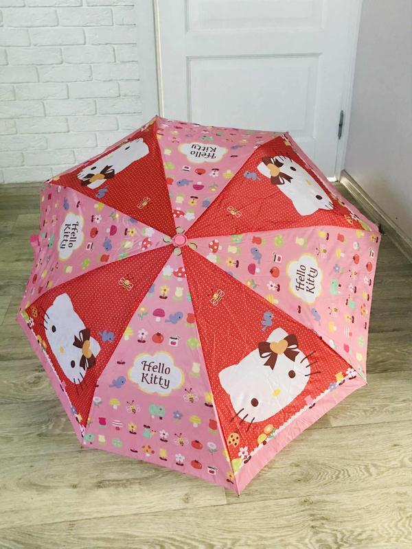 Продам гарну яскраву фірмову парасольку - Hello Kitti фірми Sanrio краіна виробник В’єтнам, 3-х ступінчата, напівавтомат, дуже зручна та компактна, розкладається - натиснувши кнопку потянути вверх, має 8шт. спиць із карбону, тканина куполу-поліестер; ручка-пластик; стан відмінний, все працює, без будь-яких дефектів довжина в складеному стані – 26см і в розгорнутому – 56см діаметр верху в розкладеному стані – 89см глибина куполу - 23см Зовнішній вигляд, дивіться на фото, на додаткові питання відповім.