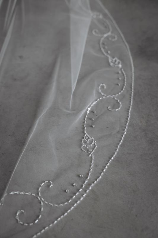 Фата вишита бісером, ручна робота. У вишивці використовуються кристали, стрази, блискітки. Край фати обшивається бісером, фата кріпиться на гребінець. 1 ярусна весільна фата. На фото довжина фати 170 см. Якісна тюль - (оригінал) - Англія, японський бісер.