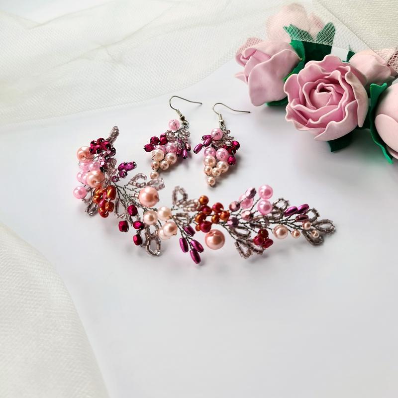 Рожеві прикраси набір для нареченої гілочка та сережки або на випускний.