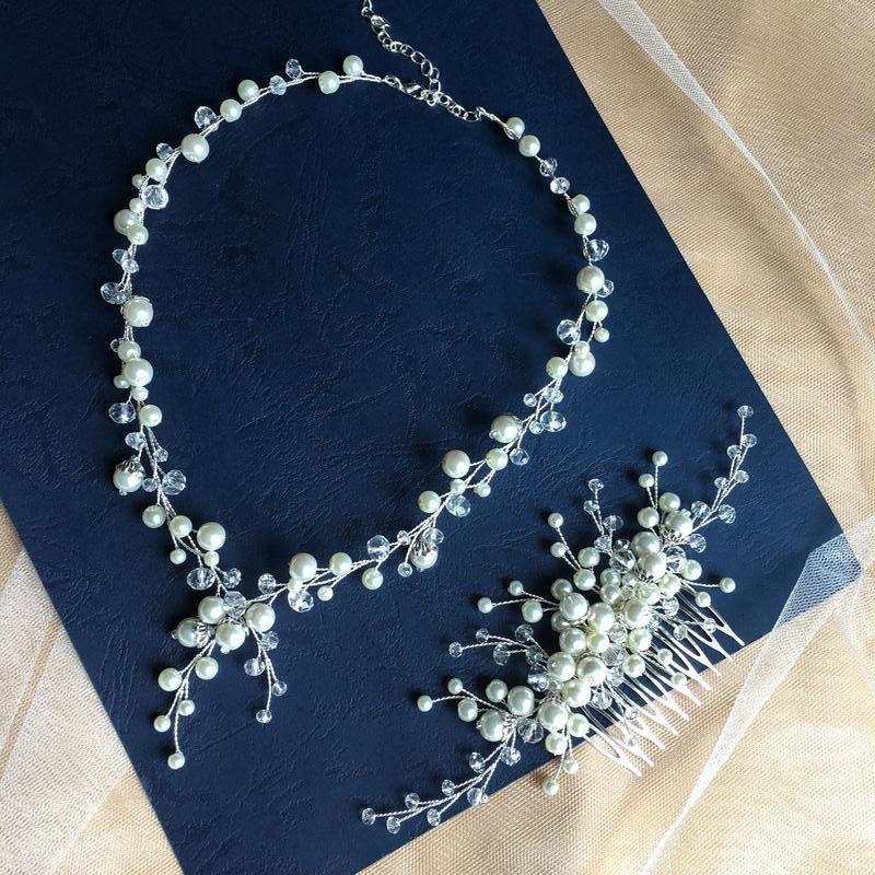 ЦІНА ВКАЗАНА ЗА КОЛЬЄ Прикраси сплетені посрібленим дротиком з хрустальних прозорих і молочних жемчужних бусин з додаванням сріблястої фурнітури. Можливе виготовлення комплекту прикрас: прикраса в зачіску (гребінь чи гілочка), браслет, сережки і кольє, дивіться на фото— Розмір плетіння гребінця меншого приблизно 13см×5,5см.- 350 грн, більший -450 грн, браслет - 250 грн, сережки 300 грн., гілочка-вінок ціна залежить від довжини. На замовлення молочні жемчужні бусини можу замінити на білі. Товар виготовляється на замовлення