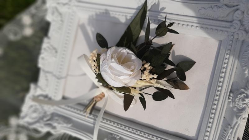 Ніжна бутоньєрка з гілочкою стабілізірованого евкаліпта, рускуса, троянди і сухоцвітів чудово прикрасить як образ нареченого, там і гостей на будь-якому заході. Кожна бутоньєрка має спеціальну шпильку для кріплення на лацкані пиждака.