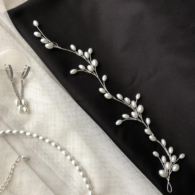 Ніжна гілочка в зачіску сплетена посрвбленим дротиком з білих овальних бусин. Довжина гілочки 22 см. До гілочки можна замовити сережки, кольє і браслет. Переходьте, дивіться всі мої роботи.