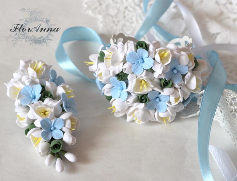 Хочете стильне і оригінальне весілля? З аксесуарами від FlorAnna Ваші образи будуть виглядати ідеально. Повітряний комплект з квітами блакитної гортензії і білої фрезії зроблений вручну з дуже легкої японської полімерної глини decoclay. Основа бутоньєрки булавка Основа під браслета металева, затискається по руці. В основу вплетені стрічки. Під замовлення можливо зробити: - заколку - гребінь -сережки