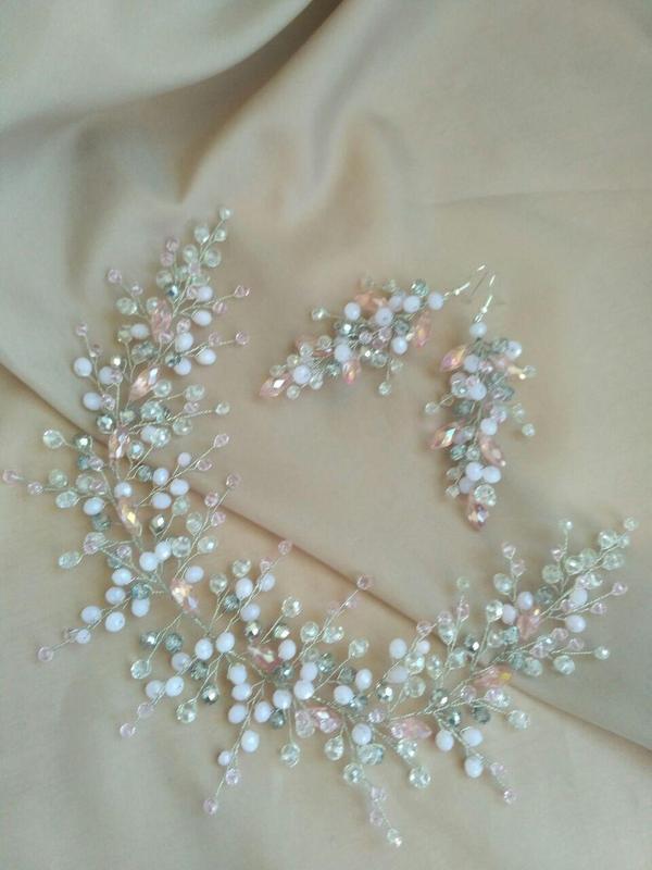 Украшения из хрустальных бусин розово-голубого цвета - это невероятно красиво и очень стильно. Нежные блестящие бусинки подчеркивают ваш непревзойденный образ. С таким волшебным украшением вам гарантировано будут обеспечены восхищенные взгляды окружающих! Веточка длиной 25 см, легко гнется, можно выложить кое-как по прическе. Веточку следует закрепить Неведимка (заколками 3-4 шт) для надежной фиксации в прическе. Возможен заказ в любом цвете до 3-х дней! Длина сережек 5 см.