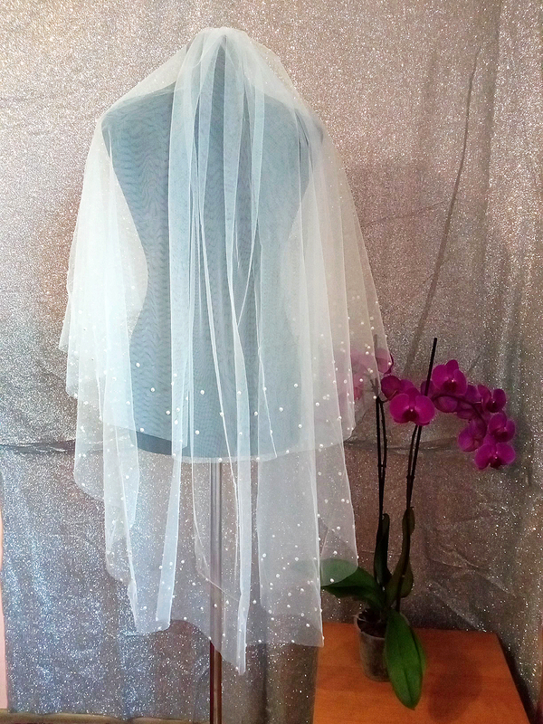 Весільна фата з перлами двошарова 130/70см.Колір білий або айворі.Гребінець пришиваємо при необхідності в подарунок.В наявності є інші розміри.Відправка 1-2 дні.