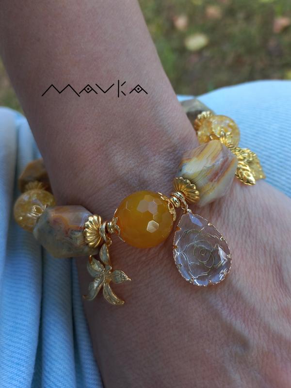 Браслет "Сонячний" Намистини Мурано, яшма 18 мм, агат 16 мм та 12 мм, цукровий кварц 15 мм, преміальна фурнітура інкрустована фіанітами. Розмір 19,5 см + 7 см ланцюжок-подовжувач. Браслет на меморі дроті. Важливо!!!! Післяплати немає! Оплата на рахунок ФОП