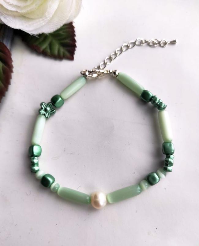 Браслет з намистинами котяче око,чеськими намистинами та натуральною перлиною з подовживаючим ланцюжком.