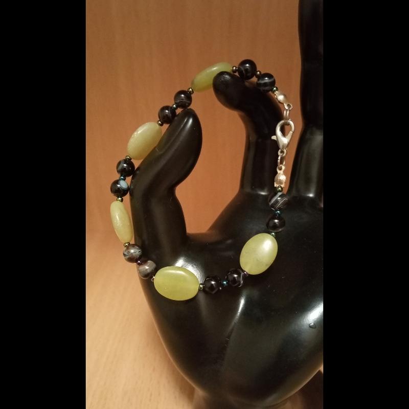браслет з натурального жадеіту та агату на ювелірному тросику. застібка карабін. довжина 19.5см. фурнітура сплав срібного кольору.
