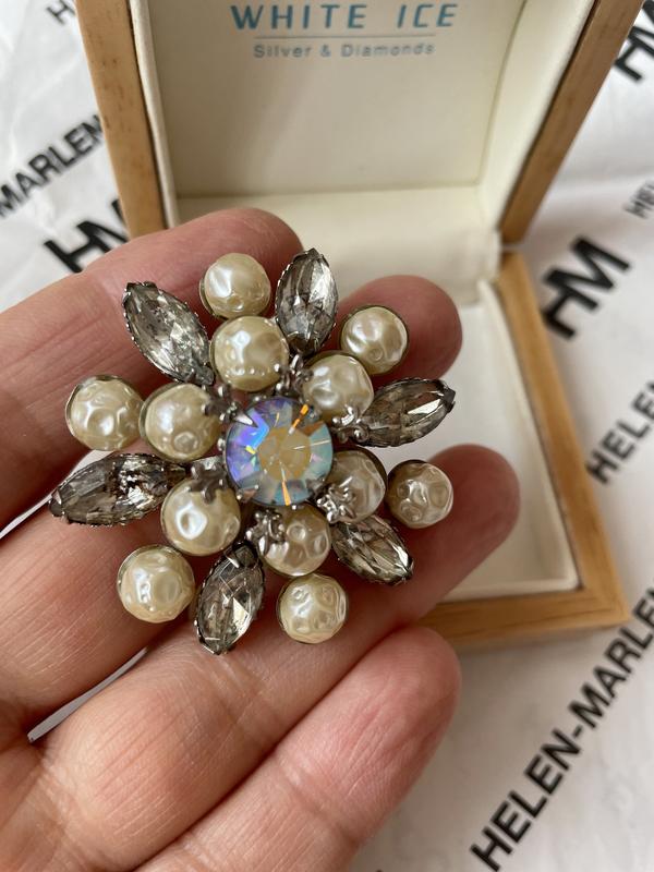 Триярусна вінтажна брошках з перлинами і кристалом aurora borealis по центру. Стан хороший (є потемніння основи у подовжених кристалів). Діаметр: 5 см