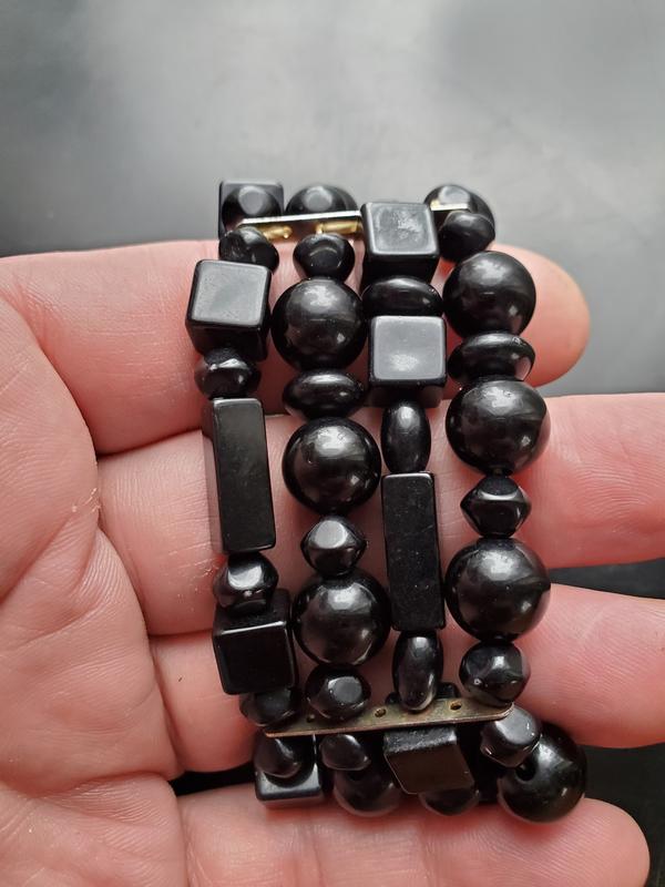 Чорного кольору пластиковий браслет у чотири лінії, зібраний на резинку, на будь який розмір жіочого зап"ястя, ширина 4 сантиметра, старезний, привезено з Америки, намистини різного розміру та форми, присутні потертості від носіння, в реалі дуже крутий, чимось схоже на бакеліт.