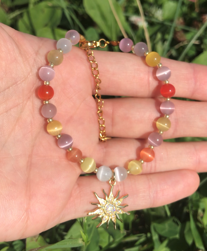 Браслет з каменю котяче око та симоволом життя, радості, успіху-сонця в гармонійно поєднаних відтінках принесе радість та допоміжний вплив. Більшість езотериків сходяться на думці, що котяче око має властивість розвивати гармонійність характеру, великодушність, вносити позитив у думки. Активізує інтуїцію, робить людину більш дисциплінованою, стійкою, впевненою в собі. Відводить біди, захищає та оберігає власника. Сонце символізує життєву силу, тепло, енергію. Камінь котяче око 6мм+бісер Сонце 2см*2см- кубічний цирконій Довжина: браслет з застібкою=17,5+5,5см подовжувач Застібка: нержавіюча сталь Колір: кольоровий як на фото Пакування: подарунковий мішечок Догляд: берегти від потрапляння води, косметичних засобів, зберігати у мішечку. Ручна робота.