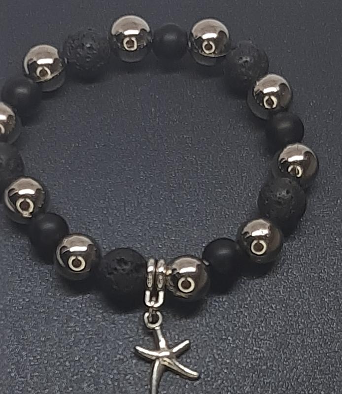 Браслет чоловічий ручної роботи з вулканічної лави та сріблястий намистин