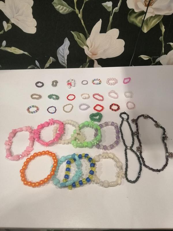 Браслети:три на 50грн. Кольца:три на 30грн. Вироби зроблені в домашніх умовах маленькою, талановитою дівчинкою моєю донечкою.