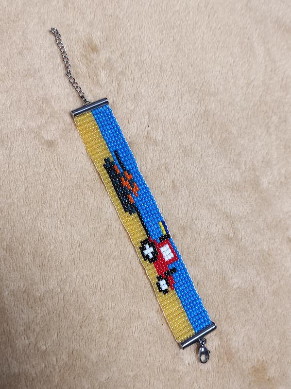 А цей тематичний малюнок нагадує нам про те, що ми обов'язково переможемо усіх ворогів! І на нашій Українській землі знову засяє сонце кольорами жовто-блакитного стягу. Браслет в патріотичних кольорах стане гарним подарунком на будь-яке свято для Вашої малечі. Виготовлений з якісного чеського бісеру і міцних поліестерових ниток. Фурнітура з нержавіючої сталі (медичний сплав). Розрахований на обхват дитячої руки, застібка має подовжуючий ланцюжок. Можна придбати у комплекті з чокером. Ширина: 2 см. Довжина: 13 см (+ подовжуючий ланцюжок 4 см) *колір орнаменту можна обрати на свій смак *виготовлення 1-2 дні.