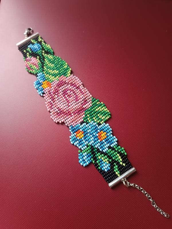Широкий браслет из бисера. Длина без застежки 15.5см. С застежкой и удлинительной цепочкой 23см