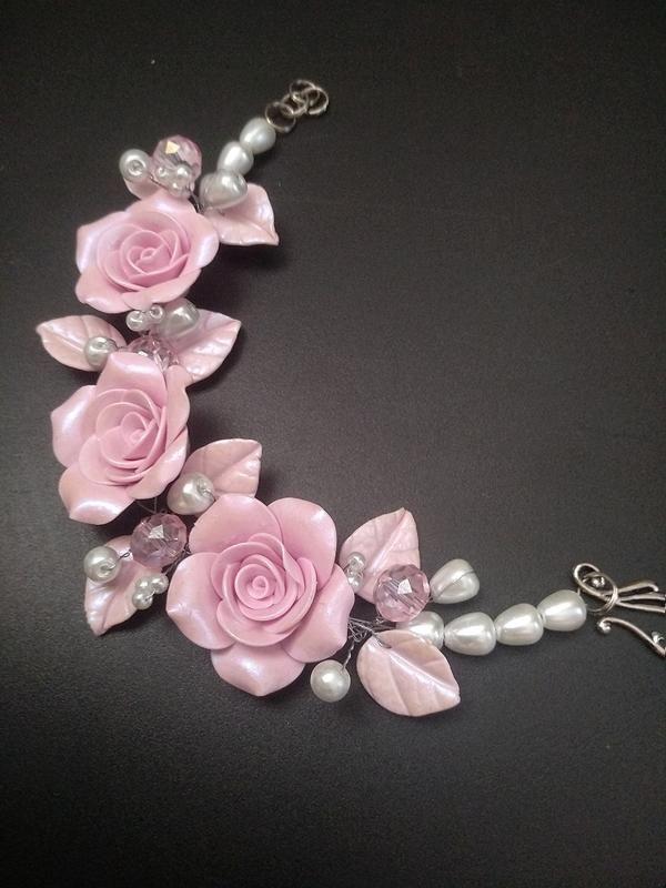 Браслет с перламутровыми розами из полимерной бельгийской глины. Авторское украшение ручной работы. Очаровательное украшение из роз ручной работы, изумительного грушеводного жемчуга Майорки, хрустальных розовых кристаллов. Цвет украшения сиренево розовый. Покрыт перламутром, при различном освещение цвет меняется. От бледно розового до нежно голубого. Браслет подходит под колье жемчужная нежность Дополнительные характеристики: Цвет : Розовый Камни / вставки : Жемчуг Материал : Полимерная глина Персонализация : С гравировкой