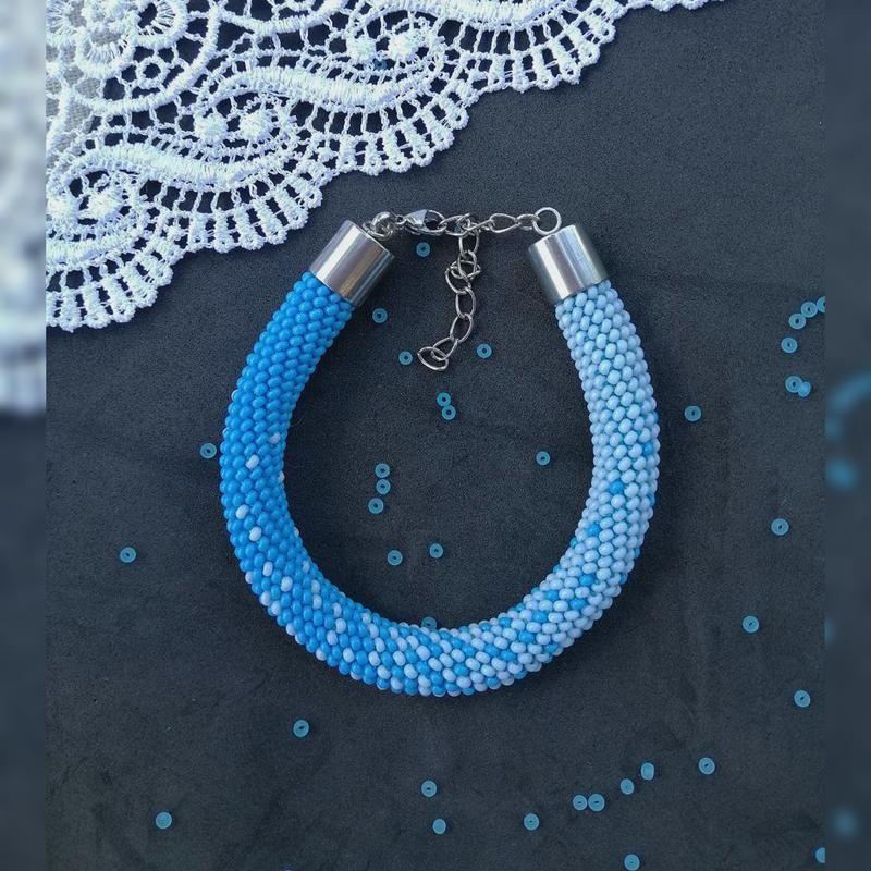 Вязаний жгут из голубого бисера с переходом цвета. Длина 18 см + 5 см удлинительной цепочки, диаметр 10 мм. Качественная фурнитура из нержавеющей стали. Дополнительные характеристики: Цвет : Голубой Материал : Бисер