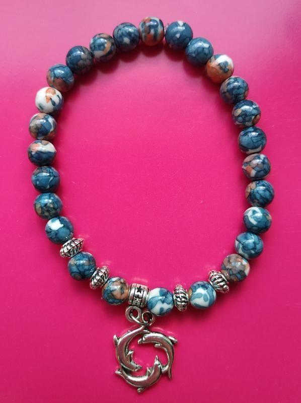 Браслет на гумці з синтетичного океанічного нефриту, з підвіскою – дельфіни. 18 див. Додаткові характеристики: Камені / вставки: Нефрит