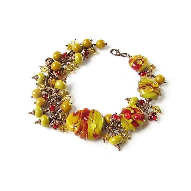 Браслет зі скляними намистинами ручної роботи в техніці лемпворк і чеським склом. Прикраса доповнено фурнітурою кольору міді. Основа половини браслета - ланцюжок, на ланках якої можна застебнути замок, що дозволяє регулювати довжину. При застібанні утворюється невеликий хвіст з підвісок. Браслет підійде на зап'ясті обхватом 15-19 див. Додаткові характеристики: Колір: Зелений Колір: Червоний Матеріал: Намистини