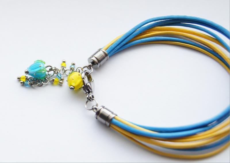Браслет "Єдинство" Матеріали: - шкіра - медична сталь - шпінель - італійське скло Намистинки-квіти виготовлені вручну з дуже гарного італійського скла. Розмір квіток 5 мм. Діаметр намистин шпінелі 2 мм. Застібка карабін. Регулюється подовжувачем. Додаткові характеристики: Колір: Блакитний Колір: Жовтий Матеріал: Намистини Матеріал: Камінь Матеріал: Медична сталь Матеріал: Натуральна шкіра Матеріал: Срібло Матеріал: Сталь Матеріал: Шнур Товар виготовляється на замовлення