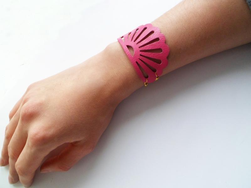 Аксесуар виготовлений з натуральної рожевої шкіри. Орнамент прорізаний вручну. Браслет м'який, приємний при носінні, має ланцюжок золотистого кольору і застібку-тогла. Виріб буде підігнано в потрібному для покупця розмірі. Товщина – 1 мм Додаткові характеристики: Колір: Рожевий Матеріал: Натуральна шкіра Товар виготовляється на замовлення