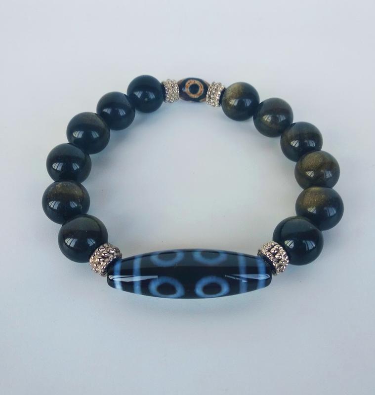 Браслет з натуральних каменів Опис: Натуральний камінь, обсидіан, діаметр 12мм. Тибетська намистина Дзі "8 око" агат натуральний, ручний розпис, 38мм*13мм Тибетська намистина Дзі "грошовий гачок" агат натуральний, ручний розпис, 12мм*8мм Фурнітура -Тибетське срібло Розмір підбирається індивідуально Підлогу Унісекс Серія "Браслети талісмани " Намистина Дзі "8 око" допомагає її власнику уникнути різних нещасть і трагедій, захищає від нещасних випадків і ударів долі. З нею повсякденне життя стає безпечніше і спокійніше. Захисна функція цієї тибетської намистини Дзі обумовлена тим, що її власник отримує допомогу і благословення від 8 божеств Бодхісатв, які захищають його від різних неприємностей. Додаткові характеристики: Колір: Чорний Камені / вставки: Агат Матеріал: Камінь