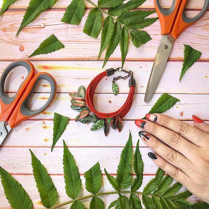 Браслет з авторськими двосторонніми підвісками з ювелірної смоли у вигляді стилізованих листків рослини маранти. Основа - заокруглена натуральна шкіра оранжевого кольору. Фурнітура - бижутерный сплав, колір мідь. Розмір регулюється. Додаткові характеристики: Колір: Помаранчевий Матеріал: Намистини Матеріал: Натуральна шкіра Матеріал: Епоксидна смола