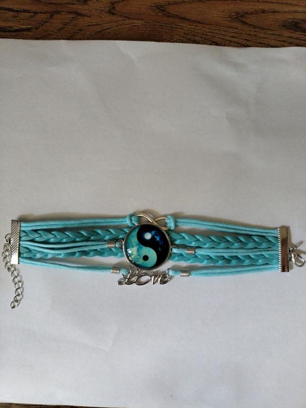Багатошаровий браслет, що символізує гармонію двох потужних стихій. Довжина браслета: 15,5 + 5см. Діаметр кабошона: 2,7см. Матеріал: біжутерний сплав, скло, екошкіра. деталі уточнюйте, можливі додаткові фото.