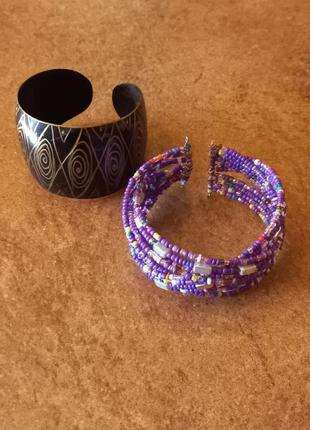 Два браслети за ціною одного- 70 грн за два . Один з бісеру,другий -з металу. Діаметр браслетів регулюється. Довжина 19.5-20см. Стан дуже гарний.