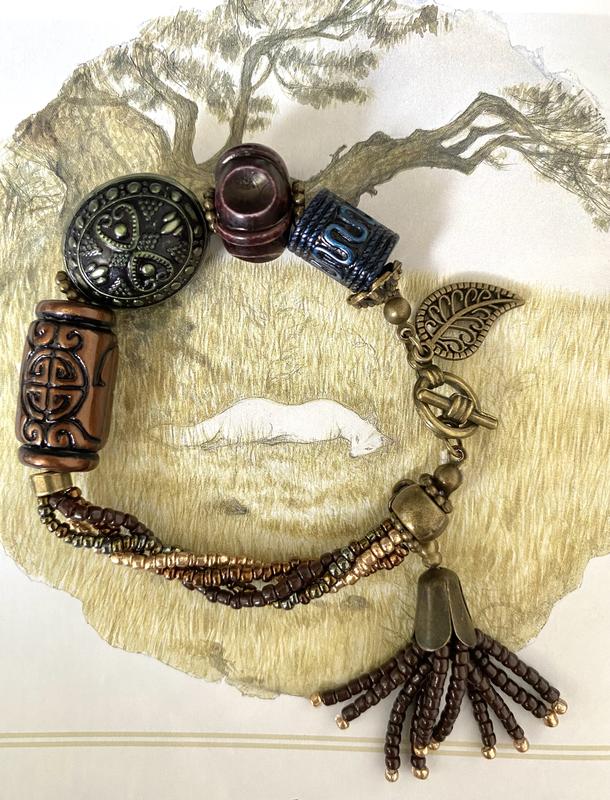 Асиметричний браслет з китицею з темно-коричневого бісеру. Жгут зроблений з чотирьох кольорів бісеру: темно-коричневий, металево-коричневий, золотий та темний хамелеон. Метал: антична бронза. Великі намистини зі східними візерунками у теплих кольорах. Ексклюзив. Є також в комплект довге намисто, що підійде до легкого літнього наряду.