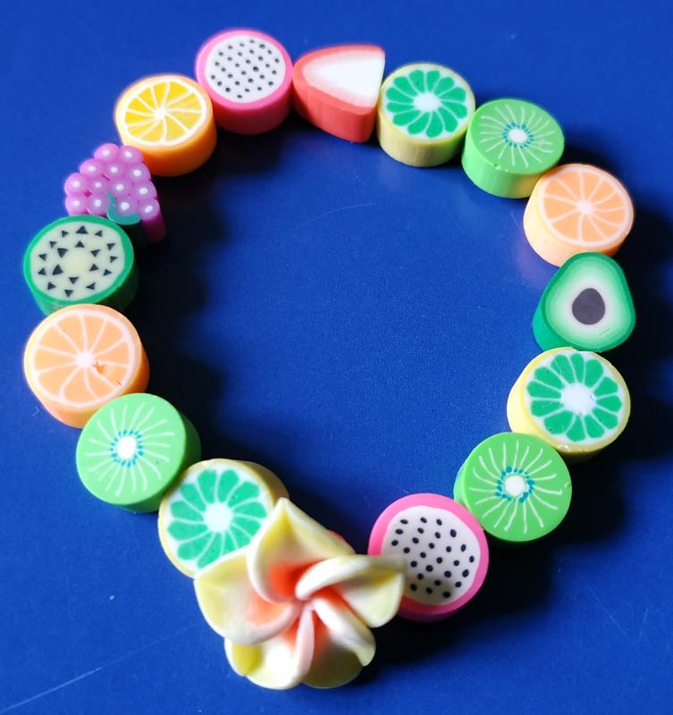 Браслет для дівчаток на резинці. Фрукти та квітка – полімерна глина. Розмір 14 см