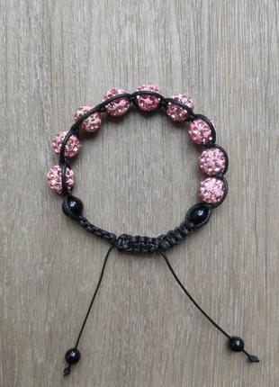 Продам браслет із намистинами Шамбала та натурального каменю агата, плетіння стандарт із шовкового шнура. Довжина обхвату браслета приблизно 16 см, розмір обхвату регулюється, ширина браслета — 21 мм. Бусини розміром 10 мм, інкрустовані стразами діаметром 2 мм. На кінцях плетіння браслета намистини з агату розміром 6 мм.