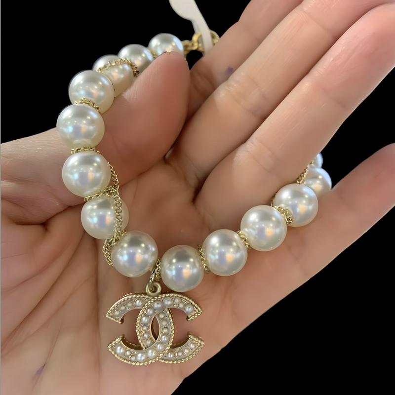 Серьги представляют собой сложный дизайн в виде перекрещивающихся линий, украшенных кристаллами и жемчужными элементами. Верхняя часть сережек имеет форму цветка с центральным жемчугом, от которого свисают два декоративных элемента, украшенные кристаллами и жемчугом. Браслет выполнен в виде цепочки с чередующимися жемчужинами и золотыми звеньями. Центральный элемент браслета -- логотип Chanel в виде переплетенных букв "C", инкрустированный кристаллами. МОЖНО ПРИОБРЕСТИ ПО ОТДЕЛЬНОСТИ Видео браслета 1150 грн - ********************************************************** Видео сережек 1980 грн - **********************************************************