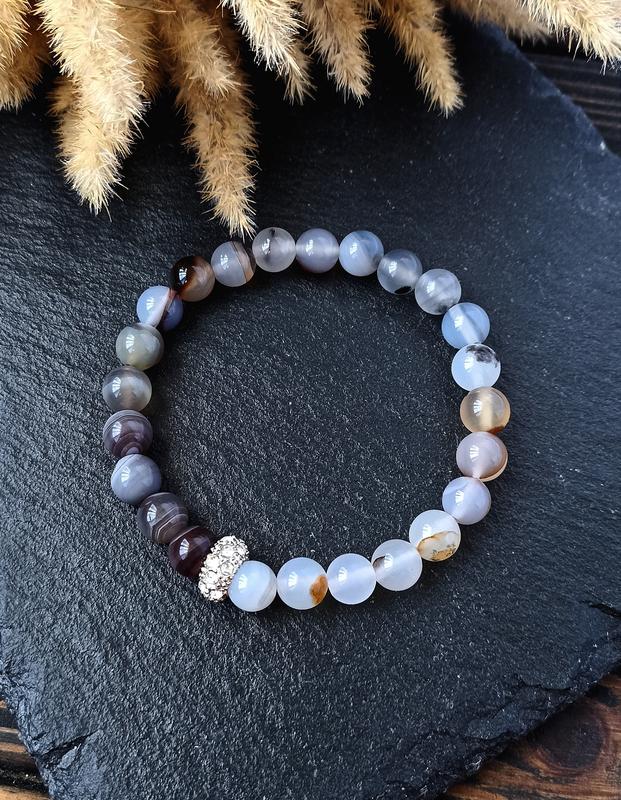 Агат Ботсвана, белый агат 💎 Размер бусин - 8 мм Фурнитура люкс Размер браслета 17-19 см Агатам издавна приписываются разные магические свойства, этот универсальный камень обладает рядом целебных свойств как для тела, так и для разума. Агат способен придает своему владельцу мужество, продлевает ему жизнь, считается символом здоровья, долголетия и процветания, способствует приумножению финансовых капиталов и улучшению на профессиональном поприще. Украшения из агата способны сделать своего хозяина красноречивым и приятным в общении, защищают его от происков врагов и разного рода негатива. Минерал принимает на себя всю отрицательную энергию, направленную на владельца. В целом все агаты можно описать как серьезный талисман от дурного глаза и негативной энергетики. Также минерал помогает сохранить и приумножить ваше финансовое состояние. Если вы хотите использовать камень как амулет, не используйте тонированные агаты и берегитесь подделок. Например, фиолетовые агаты в естественном виде не встречаются!