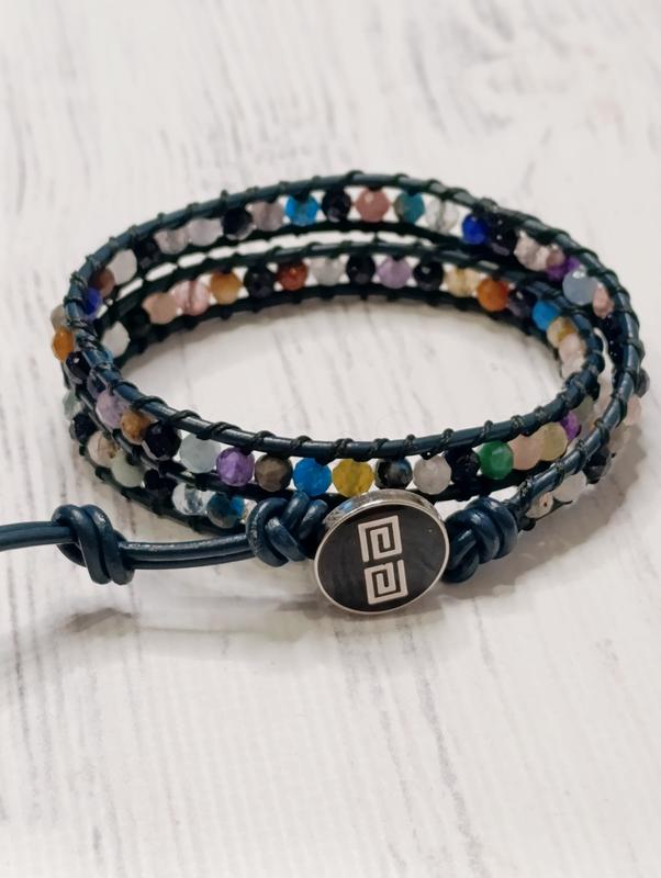 Браслет в 2 оберти. Кожаный шнурок,бусины из камней мх. (авантюральный,гат,кришталь,кварц...) 4 мм. Подойдет на руку 16-19 см.