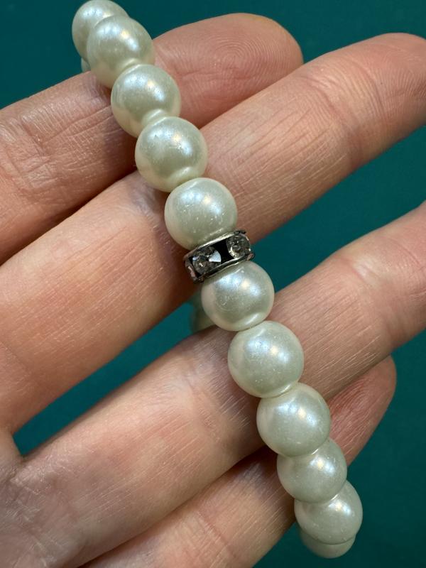 Браслет на резинке. Намистины с серебряными вставками с камушками.
