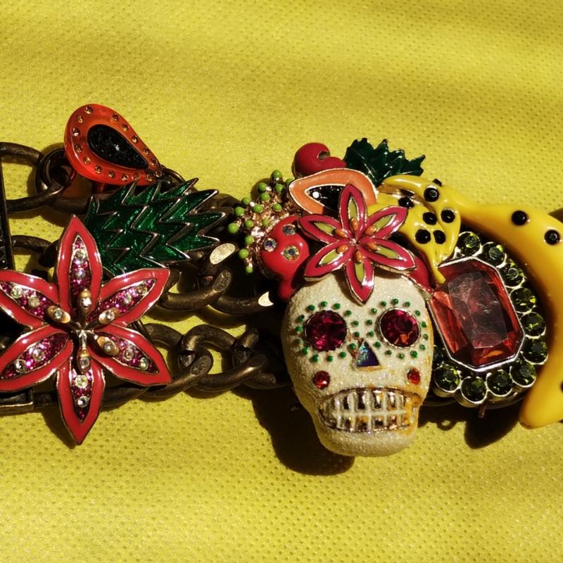 Браслет вінтажний Betsey Johnson, США ДЕКОР: Череп (ніби покритий цукром), Ананас, Банан, Вишні, Змія, Кристали. Ланцюжок: Серце з гравіюванням BJ/Betsey Johnson. Стріла, що є частиною застібки. МАТЕРІАЛ: метал бронзового відтінку/епоксидна смола/кристал/емаль РОЗМІР: довжина по об'єму руки 19см, ширина браслету 4см, череп у дожину 5 см ДЕФЕКТ : у квітки немає одної тичинки, на одній вишеньці немає камінчика, череп має виробниче забруднення слідами жовтої фарби. На руці того майже не помітно. Розмір та дефекти видно на фото.