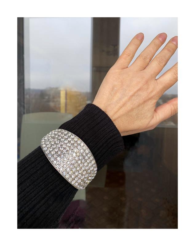 Браслет срібного кольору з камінцями білого кольору. Прикраса для святкових подій Була у використанні Сліди використання мінімальні, на носіння абсолютно не впливають Всі камінці на місці, при штучному освітленні гарно виблискують, переливаються Заміри на фото