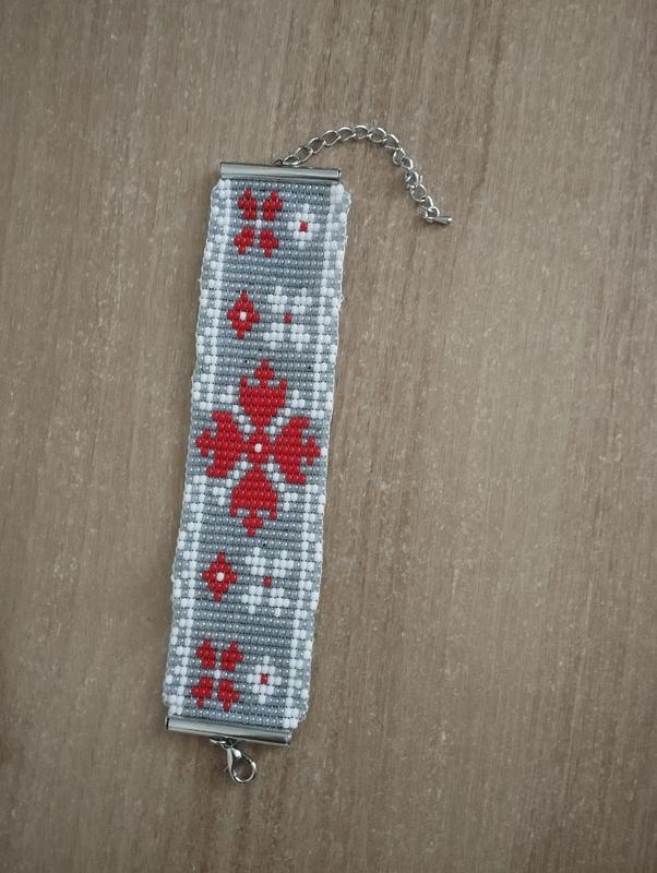 ширина 3,5 см довжина 14 см (+ 5 см ланцюжок) в кольорах: білий, сірий, червоний ручна робота в патріотичному стилі