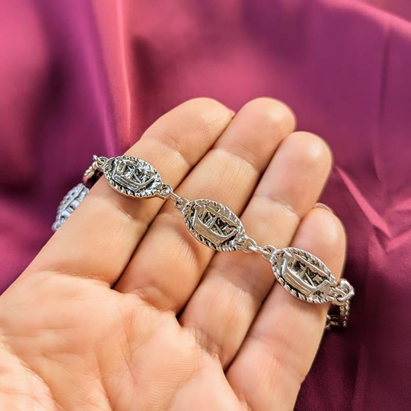 Рідкісний вінтажний браслет, на якому зображений Дракар - корабель вікінгів. З епохи вікінгів минула вже тисяча років, але досі дивує, як вони в ранньому Середньовіччі так майстерно плавали морями. Головною гордістю їхнього флоту прийнято вважати дракари. Ці військові кораблі вікінгів завдяки особливій конструкції були одночасно міцними та дуже швидкими. Назвали військовий корабель так, тому що на його носі обов'язково кріпилася голова дракона чи міфічної істоти. Та й сама форма судна була вузькою і довгою, що нагадує морського змія. Прикраса виконана із ювелірного сплаву сріблястого кольору, родієве покриття Гарний вінтажний стан. Маркування: SCOTLAND Довжина: 19,5 см.