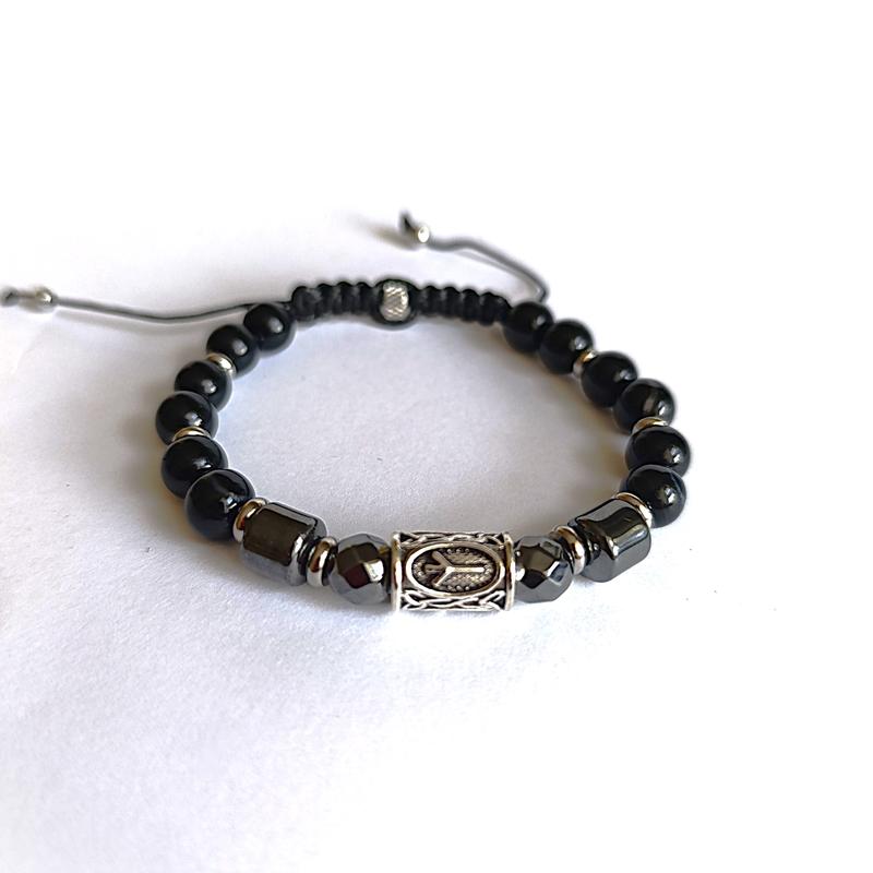 Захисний браслет на затяжці чорний агат + гематит + руна альгіз №2