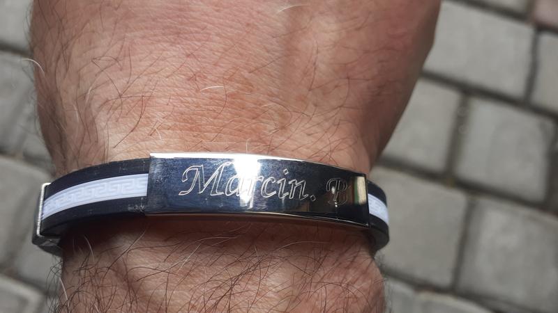 Стальной браслет с гравировкой на черном силиконовом ремешке - памятный подарок парню, девушке.(Великобритания).Новый.ширина запястья до 22см.