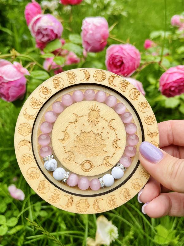 Браслет з натурального каміння кахолонг і рожеве котяче око 🤍 Кахолонг — камінь ніжності, жіночої сили й турботи 🌸 Властивості: • Символ спокою, материнської підтримки, жіночої глибини. • Дарує внутрішню лагідність, стабільність і прийняття себе. • Заспокоює серце, пом’якшує рани від зрад, самокритики, жорстоких слів. • Гарно працює з жіночим тілом, особливо у період зачаття, вагітності або емоційного виснаження. ⸻ 🐱 Котяче око (рожеве) — інтуїція, магнетизм, самозахист Котяче око — це не натуральний камінь, а скло або штучно вирощений кварц із ефектом “котячого блиску”, проте воно все одно несе сильну енергію символіки й форми. 💗 Символіка рожевого котячого ока: • Чуттєвість, жіночність, м’яка привабливість. • Спрямованість у інтуїцію, внутрішнє бачення, передчуття. • Сприяє розвитку тонкої чутливості, вміння читати людей і емоції. • Захищає ауру — особливо, якщо ти чутлива до чужих емоцій.