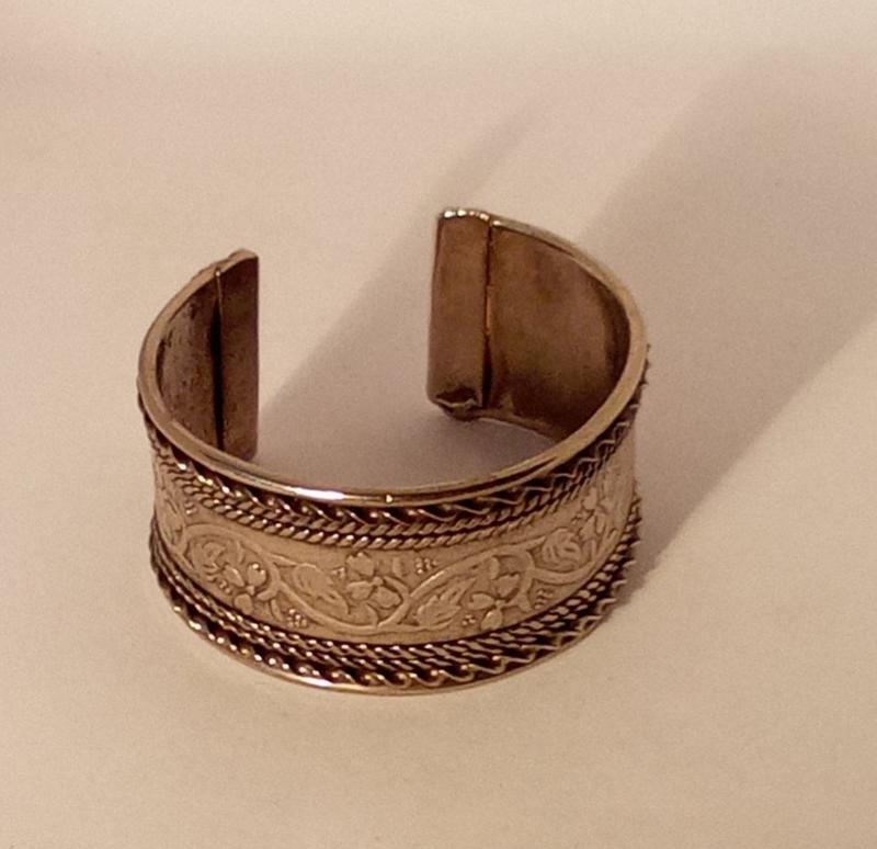 Вінтажний жіночий браслет кафф (манжета). Прикраса зроблена в етно стилі з чиканими квітковими візерунками. Такі прикраси належать до культур Індії , країн ближнього Сходу та Азії. Прикраса зроблена з ювелірного сплаву срібного кольору.