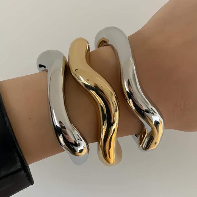 Набор неаккуемых волнистых браслетов 3 штуки серебристые и золотистый