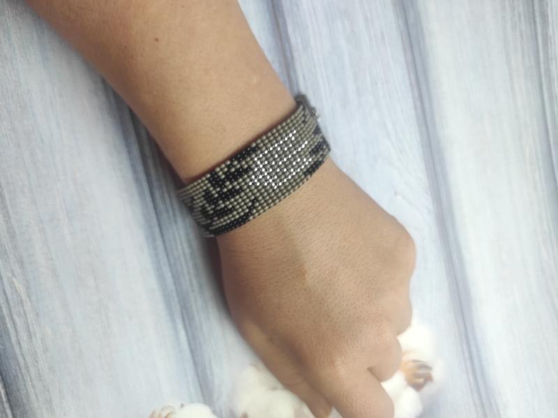 довжина 16см + застібка з ланцюжком, ширина 2.2см, виготовлено з чешського бісеру.