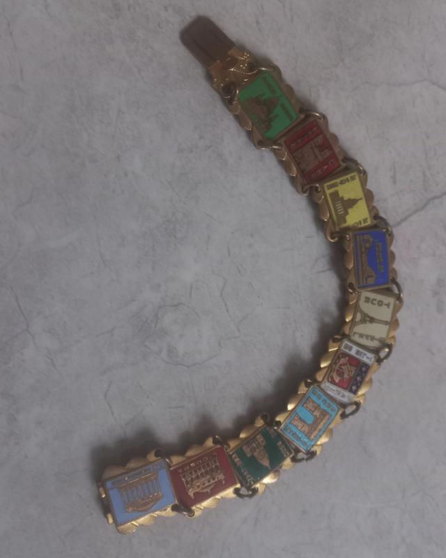 дизайн у формі рамки з суцільної латуні та насичені відтінки емалі (від трав'янисто-зеленого та кобальтово-синього до небесно-блакитного та жовтогарячого) роблять його чудово виконаним екземпляром у приголомшливому стані. На браслеті зображені деякі з найулюбленіших місць Парижа: Опера, Сакер-Кер, Нотр- Дам, Ейфелева вежа, Тріумфальна арка, Палац Шайо, Пантеон,церква Мадлен.