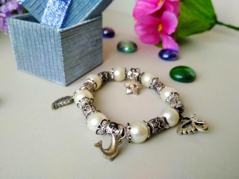 Браслет на резинці. Виріб декорований підвісками. На деяких намистинах є дрібні, майже непомітні подряпини.