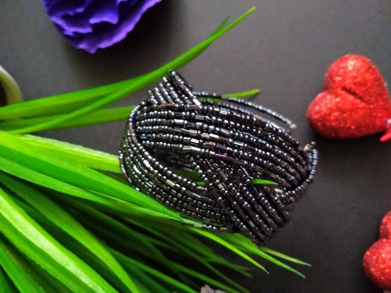 Браслет на дротяною основі; з круглим і довгастим бісером . Розтягується. Діаметр браслета в стягнутому вигляді: 5,5 див.