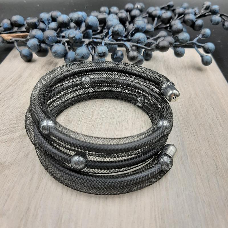 Легкий чорний браслет на три витка з ювелірної сітки. Зібраний на дроті з пам'яттю, ідеально тримає круглу форму. Всередині намистини - майорка